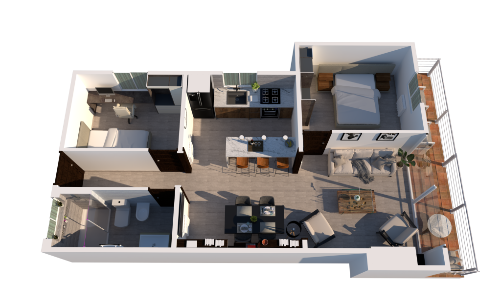 comedor, integrándose a estas sutilmente mediante una barra tipo isla conformando en un todo el ambiente social