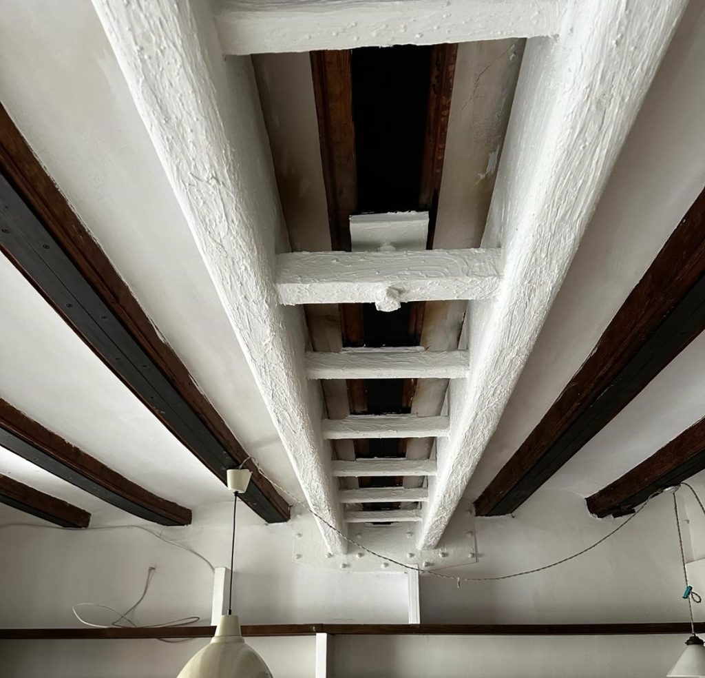 En este piso, se encontraba un desgaste estructural en una de las vigas, la cual estaba apuntalada para evitar su desplome.