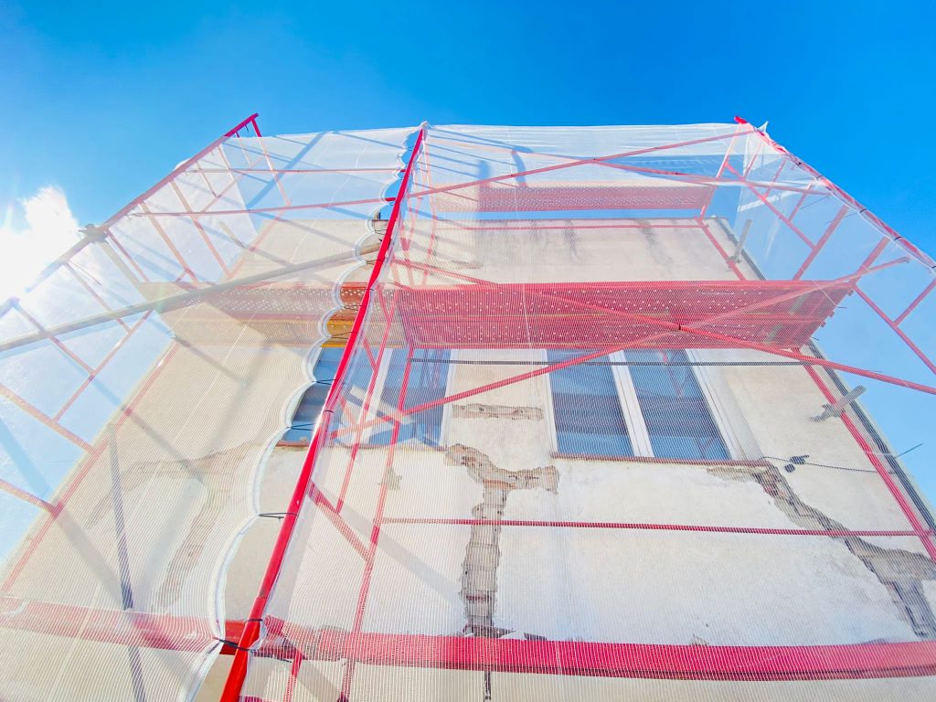 Rehabilitación y reparación de grietas en fachada con mortero de reparación + malla + mortero de cal + imprimación